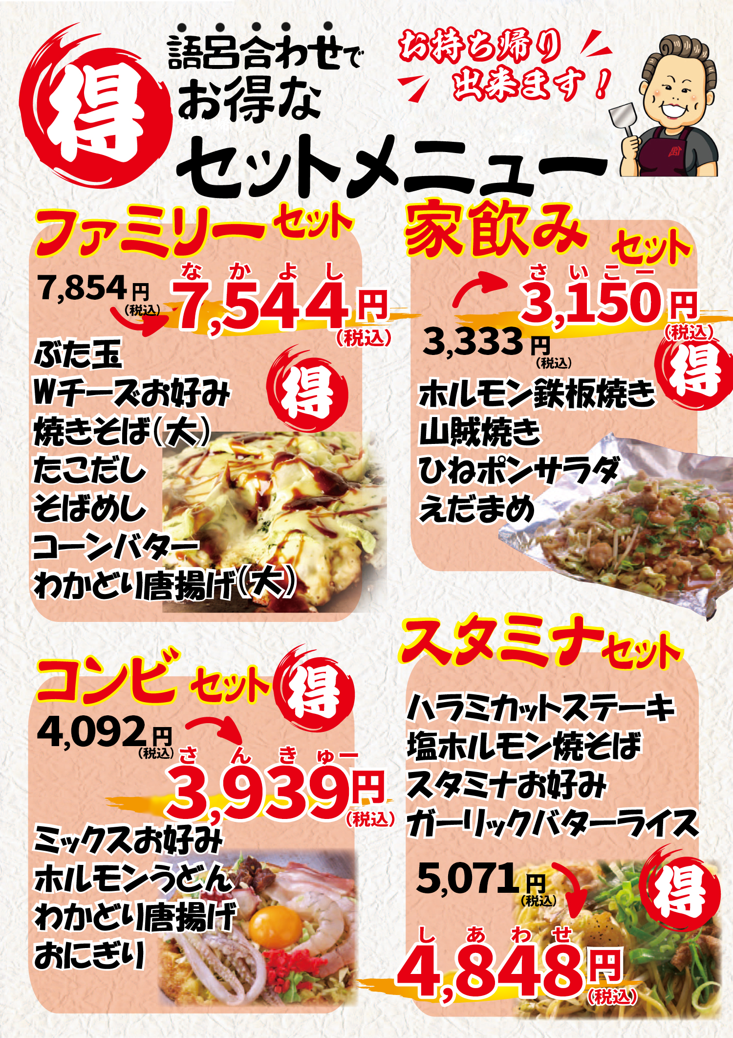 お持ち帰りで10%OFF+消費税率も8%ですので非常にお得です^^ 是非ご利用下さい♪ ※写真の表示価格は店内飲食の価格です ※船場丼池店、吉田駅前店、住道北口店は、7月26日〜セットメニューの販売を開始致します ~~対象店舗~~ 高砂本店・尾上店・東加古川店・三木店・姫路駅南店・砥堀店・宝塚店・出屋敷店・吉田駅前店・住道北口店